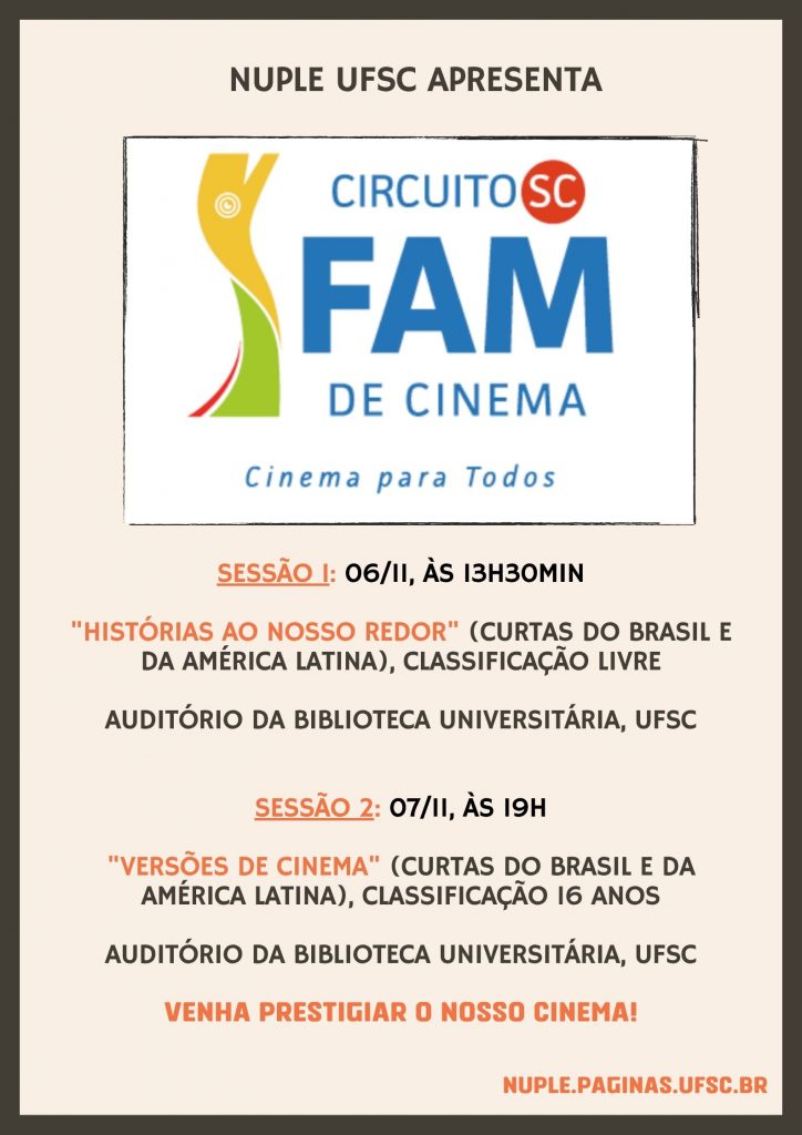 O NUPLE será um dos pontos de exibição da mostra itinerante FAM (Florianópolis Audiovisual Mercosul). A entrada é totalmente gratuita, e as exibições acontecem nos dias 6 de Novembro (às 13h30min) e 7 de Novembro (às 19h), no Auditório da Biblioteca Universitária.